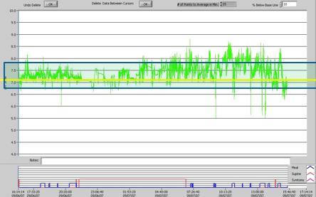 Diese Messung wurde an einem mit Medikamenten behandelten Patienten durchgeführt, der noch immer reichlich Stille Reflux-Symptome aufwies. Was man hier sieht ist, dass der pH-Wert vielfach über 8 liegt und auf 9 ansteigt. Dies ist eindeutig alkalischer Reflux.